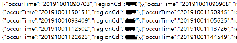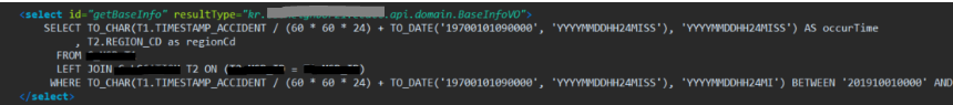 Mapper로 부터 얻어올 데이터는 Params로 받은 시작날과 끝나는 날 사이에 있는 사고발생시간인 occurTime과 발생지역 코드인 regionCd가 될 것이다.